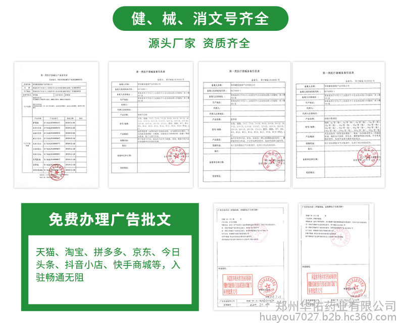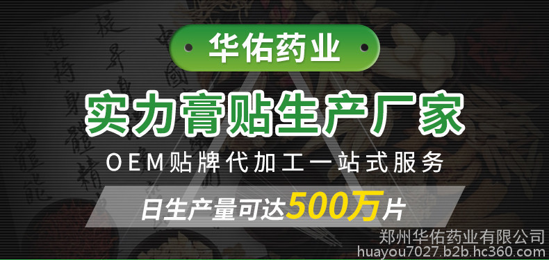 郑州华佑医药科技有限公司是外用保健用品专业生产加工企业,公司拥有完整、科学的质量管理体系,公司以市场为导向,以高新技术为内涵,积极开发新产品,现阶段以专业研发、生产和销售科技健康产品和医疗用品为主要业务。公司现拥有大型涂布机、切片机、分切机数十套,日产数十万片,公司现有一类、二类医疗器械批号、健字号数十个、消字号等批准文号,满足用户贴牌需求!主要产品有:传统外用贴剂、新型**剂、儿童保健贴、男性/女性用贴、热灸保健膏、抑菌喷剂/乳膏/粉剂等上百种产品。欢迎各界朋友莅临参观、指导和业务洽谈