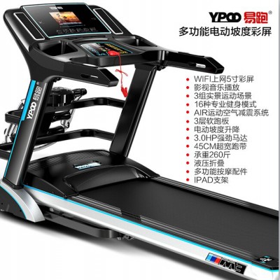 WIFI上网7寸彩屏、影音音乐播放、3组实景运动模式、16种专业运动模式、AIR云端空气减震、3层软跑板、电动坡度升降、3.0HP强劲马达、45cm超宽跑带、承重260斤、液压折叠、多功能按摩配件、IPAD支架