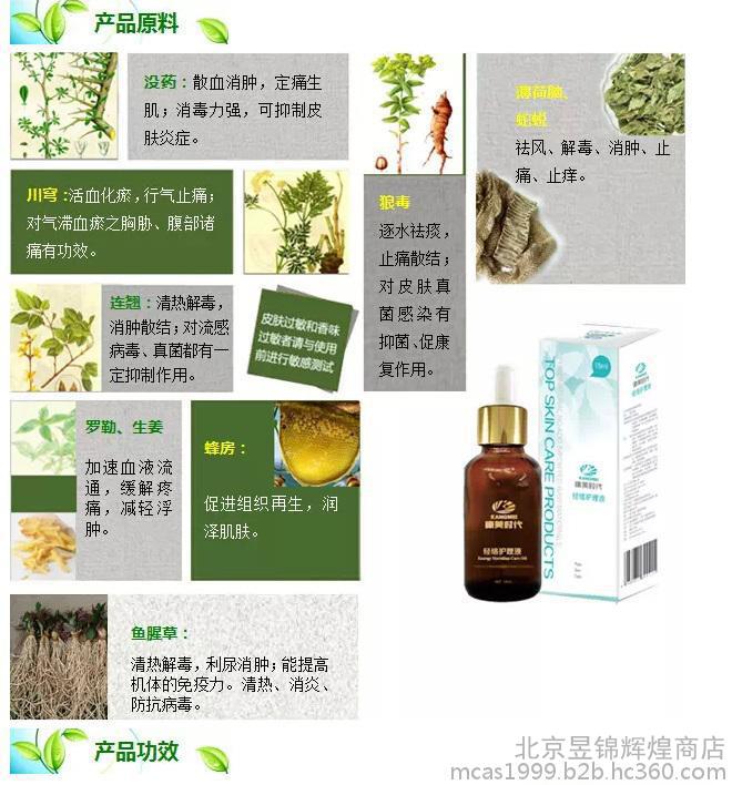 【其他成分】没药、狼毒、蛇蜕、川穹、连翘、鱼腥草、罗勒、生姜、蜂房、薄荷脑等植物提取精油,纯化水。