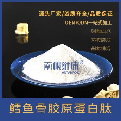 鱼胶原蛋白肽以深海鳕鱼骨为原料,经定向生物酶解-发酵双联技术提取,物理方法脱腥脱色、超滤、脱盐、浓缩、压力喷雾得到的高纯度蛋白肽。