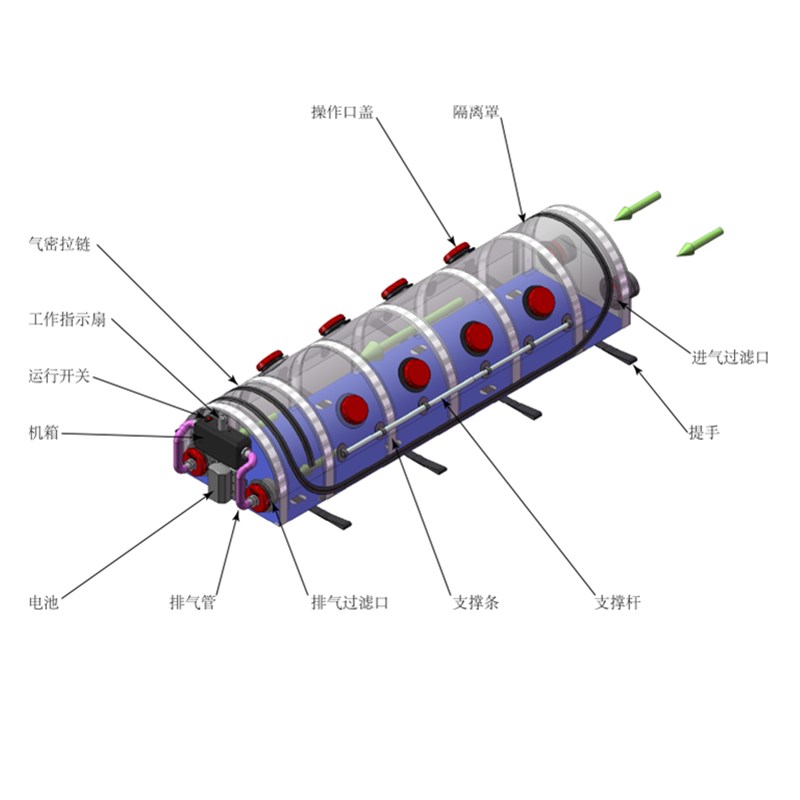 负压隔离舱 产品由舱体、过滤装置、电气控制部分、正压气体单向阀、负压气体单向阀。附件:直流电源线、电池、操作手套组成。 舱体由隔离罩、操作口盖、支撑杆组成。其中操作口盖上有氧气接入阀,预留仪器通讯口、输液管孔位置。 隔离罩由塑料材质制成,支撑杆由塑料、铝合金材料制成。 a) 环境温度:-10℃~50℃; b) 相对湿度范围:≤93﹪ c)大气压力:86.0kPa~106.0kPa d) 电池充电电压:DC36V,车载供电DC12V e) 消耗功率30VA;支持车载电源