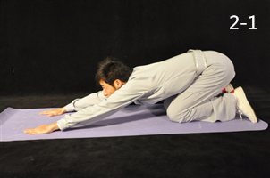 动作2:双手固定于席,用力前推,同时臀部尽力后坐(图2-1)。