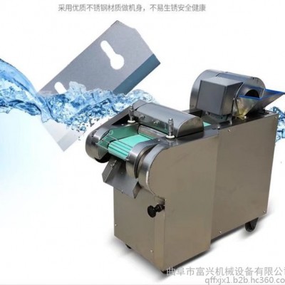 多功能型切菜机包含单切机的所有功能的同时,也可切圆形如土豆、萝卜等。 可将根、茎、叶等蔬菜加工成片、丝、丁、菱、曲线、花丁、花片等。切片装置用于硬菜(萝卜、土豆、水果、薯类)的切片,厚度在1-10毫米内自由调整;往复竖刀将刀成的菜片或软菜(韭菜、芹菜)切成直丝或段、曲线丝、方丁(或形刀)输送带每次移动距离1-20毫米自由调整。所调整量即为丝段的宽度;应注意被切菜直径较粗时(大于30毫米)出片效果才好,便于切丁,直径小时制的片或丁将会杂乱。被切菜加工面平整光滑、规则,组织完好,保持手工切制的效果。具有外形美观,操作简单,使用维修方便等特点。可切香葱、香菜、菠菜、韭菜、韭蒜、芹菜、豆角等茎杆茎叶物料段形,也可以切海带、荷叶、烟草成丝状,宽度自由调节。