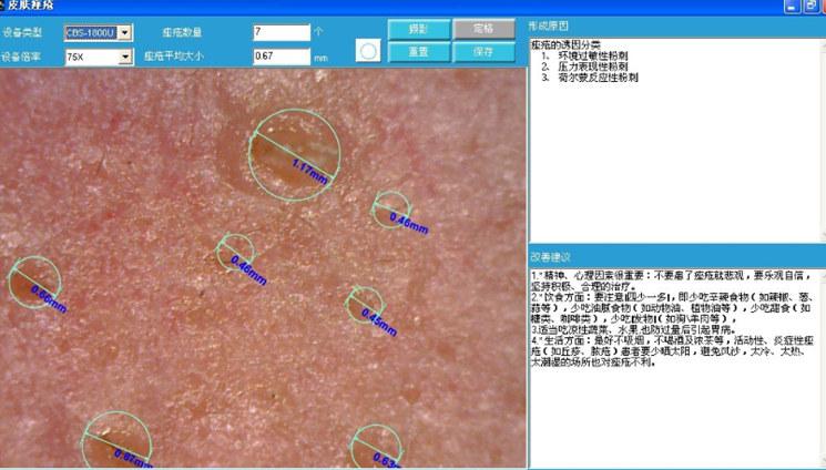1、通过拍摄一张面部肌肤图片,瞬间分析出病人皮肤的数据,例如:检测弹性,系统分析完成之后,会弹出“皮肤弹性45%”,并得出结论“皮肤弹性较差”。