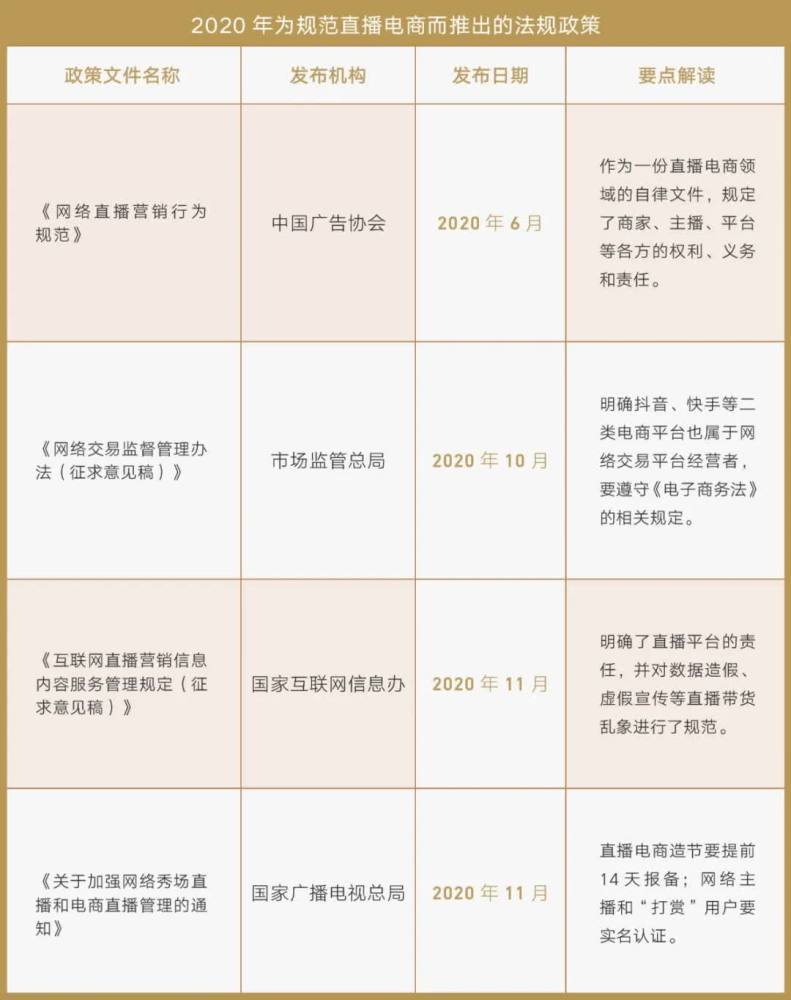 当然针对当下直播电商领域的乱象,相关部门也出台了相关文件进行规范。其中在2020年6月24日,中国广告协会发布了《网络直播营销行为规范》,虽然这只是一份自律文件,不具有强制性,但迈出了直播电商规范化的第一步。之后,市场监管总局、国家互联网信息办和国家广播电视总局也出台了相应的直播电商法规。